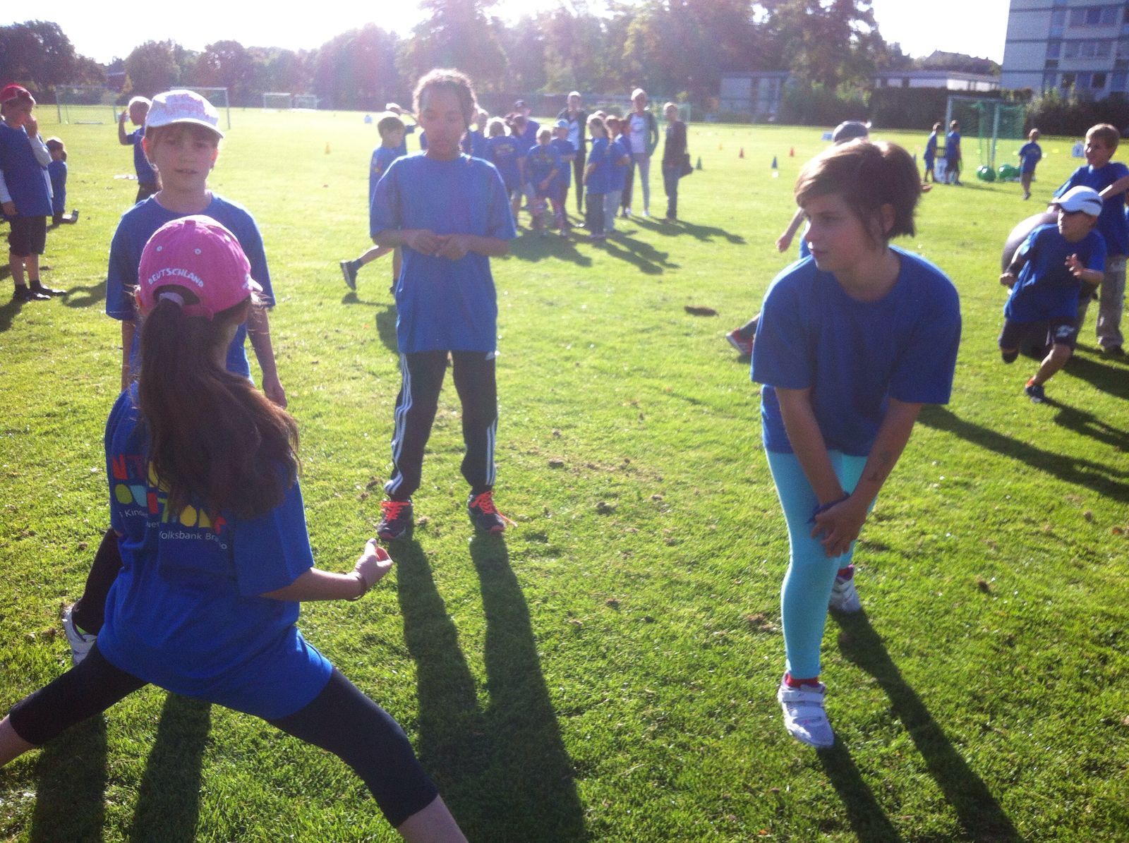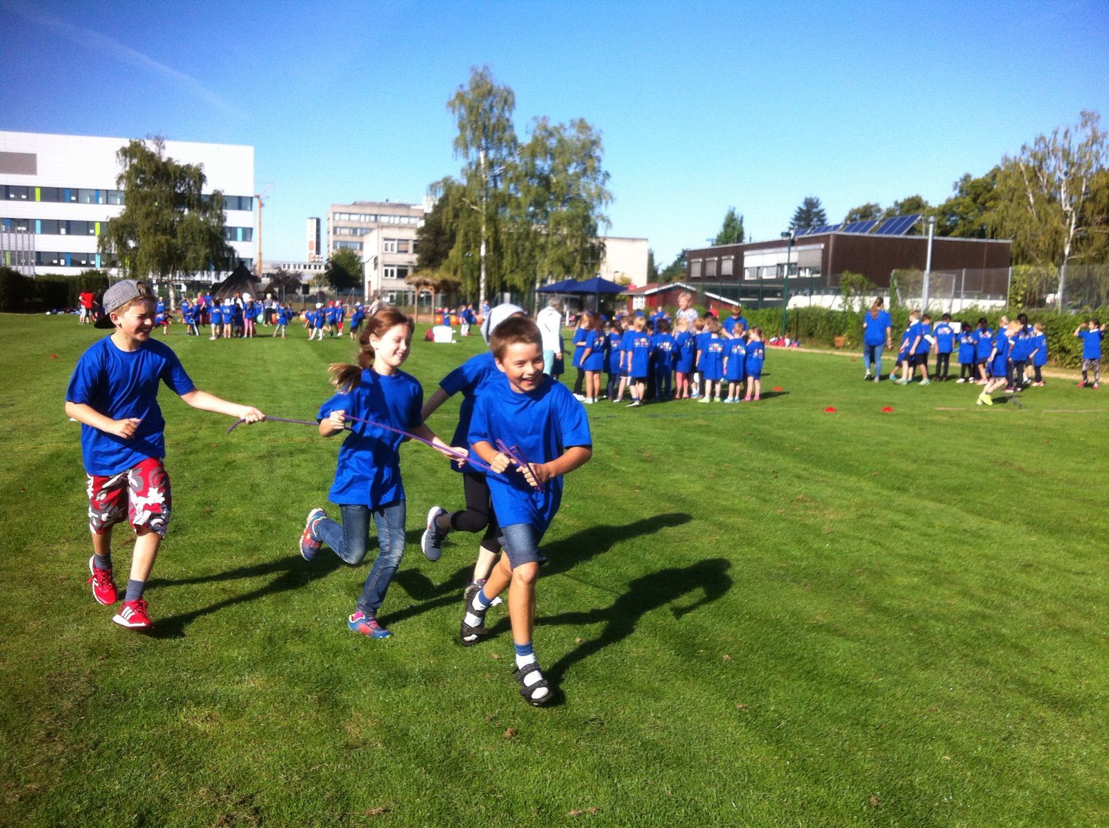Bei strahlendem Wetter durchliefen sie 10 sportliche Stationen, die von motivierender Musik begleitet wurden. Die Kinder wurden reichlich mit Brötchen, Saft, Wasser, Obst und Gemüse versorgt, die nach der vielen Bewegung noch umso besser schmeckten. Nach dem finalen Staffellauf, bei dem auch unsere Bürgermeisterin anwesend war, ging es mit dem Bus zurück zur Schule.
